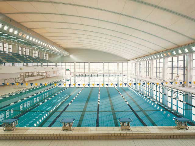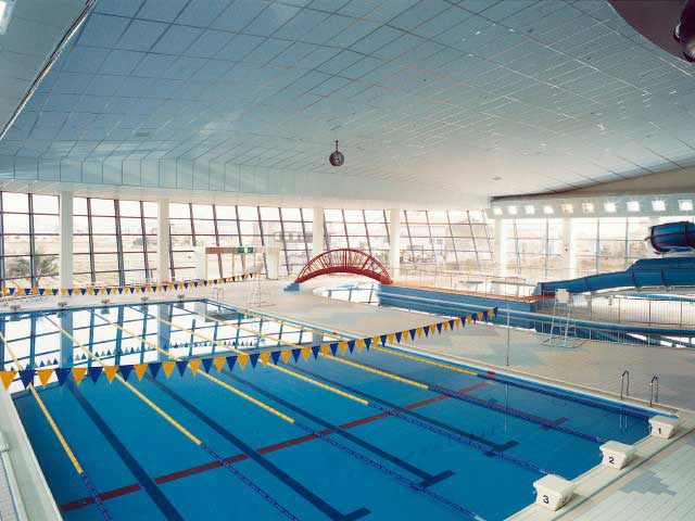 50m公認プールのほか、レジャープールも充実の屋内温水プール