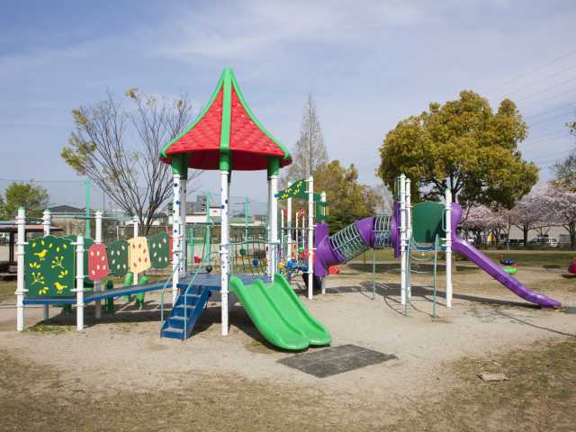 子供たちが楽しめる遊具が豊富で、小高い山の斜面に造られたローラー滑り台は特に人気。隣接の多加木緑道には、親水施設や日本庭園などがある散歩道が整備されている。