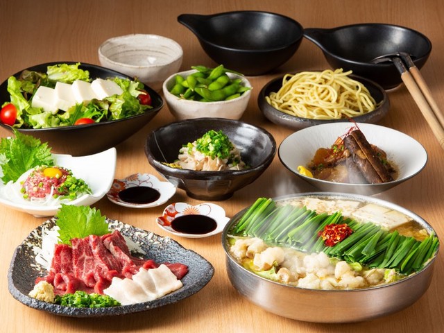 もつ鍋は九州味噌や西京味噌など数種類の味噌を独自にブレンドした味噌ベースの「みそ」、ポン酢とダイコンおろしで食べる「水炊き風」、ポピュラーな「正油」の3種。おおやま特製のタレを加えた濃厚美味(こゆうま)もつ鍋。口の中でとろけるようなプリプリの和牛もつを堪能することができる。