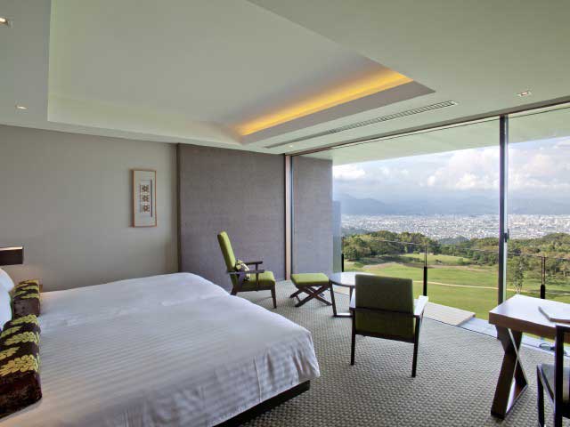 静岡県内でも屈指の景勝地である日本平に建つホテル。環境にも配慮した国際水準の建築に、伝統と温かなもてなしが融合。ホテルに面した広い芝生庭園と、その先に見える清水の街並み、駿河湾、富士山のパノラマは息をのむ美しさだ。