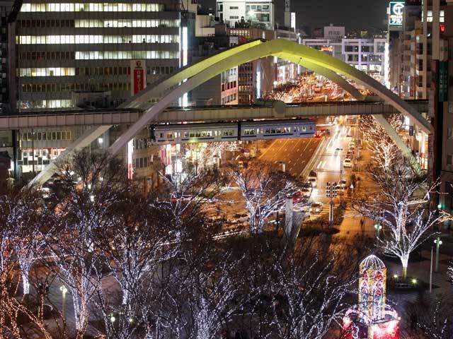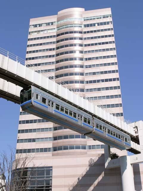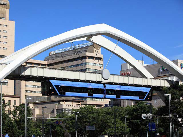 鮮やかなスカイブルーの車体と洗練されたデザインが印象的。レールから吊り下がる「懸垂型」と呼ばれるモノレールで、空中散歩の気分が味わえる。