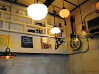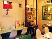 手づくりのアンティークカフェ。古いミシン台やタイル地のテーブル、たくさんぶら下がった照明など、すみずみまで凝ったつくり。