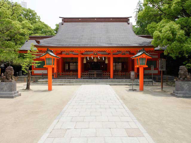 開運、縁結び、相撲の神として崇敬されている筑前国一之宮。現在の社殿は元和9(1623)年の建築で、国の重要文化財。境内の一角に能楽殿がある。