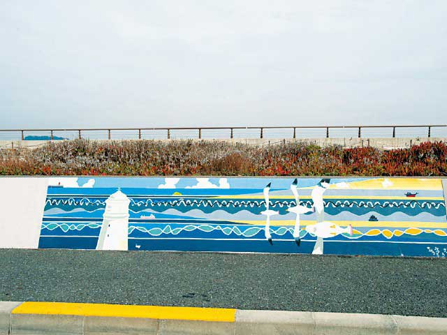 馬堀海岸沿いの防波堤に約1kmにわたって描かれた20点ものカラフルな壁画で、海と横須賀をテーマに横須賀市民により制作されたアート作品。海岸沿いの遊歩道からは富士山が見えることも。