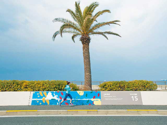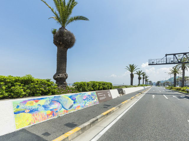 よこすか海岸通りを東に向かい、観音崎へと至る途中にある海岸。ヤシの木が立ち並ぶ海岸道路の護岸には約1.5kmにわたってカラフルなアートペイントが施されている。