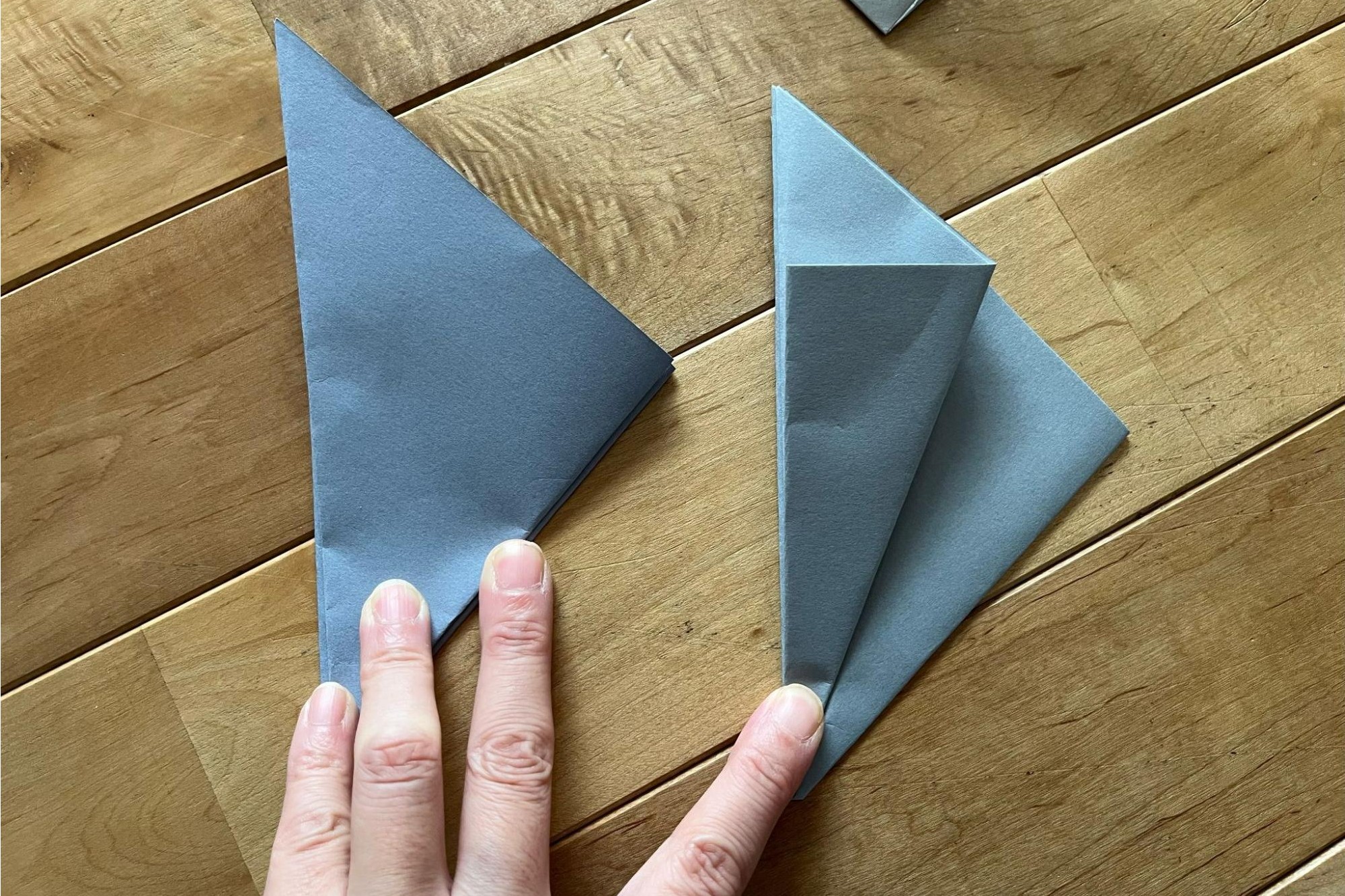 正方形の画用紙を3枚用意します。3枚とも、三角形→さらに三角形→さらに三角形と3回折っていきます。