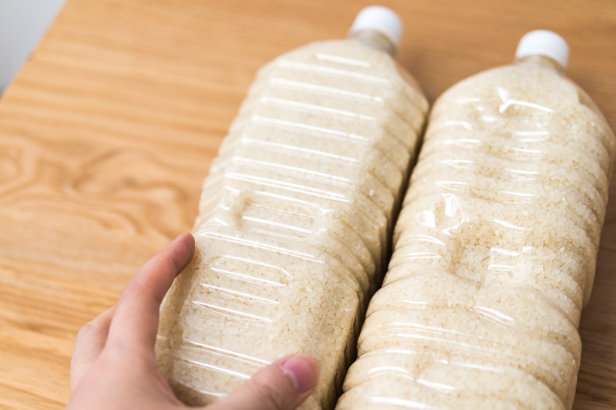 ペットボトル容器をよく洗ったあとにしっかり乾燥させれば、これ以上ない立派な密閉容器になります。お米をペットボトルに入れて、冷蔵庫の野菜室で保管します。ペットボトルなら、計量カップへお米を注ぐことで簡単に計量できるのも、メリットといえるでしょう。
