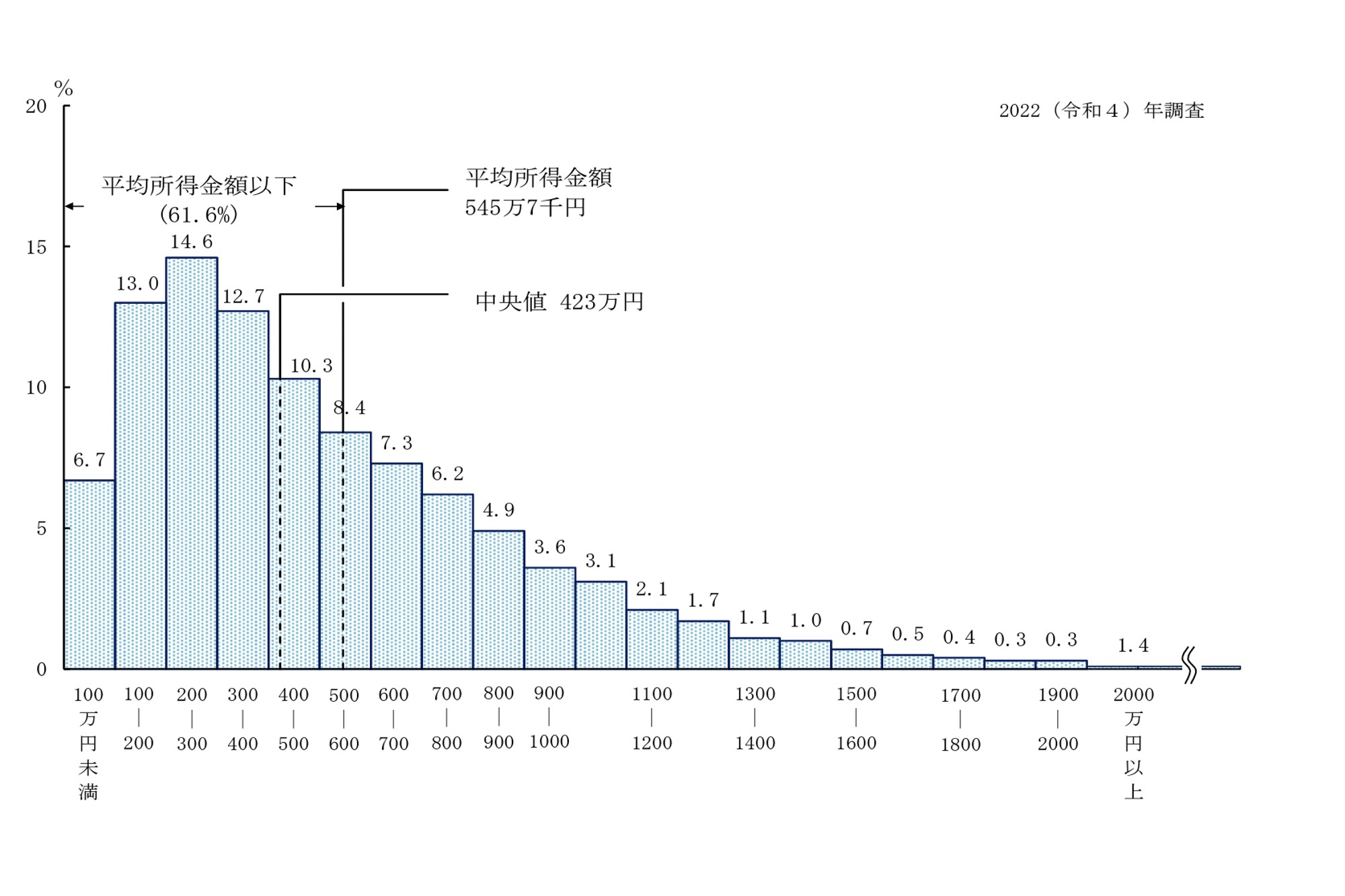 厚生労働省の令和4年国民生活基礎調査では、2022年の世帯所得800万円超の家庭は全体の21.1%で、1,000万円超の家庭は全体の12.6%、1,400万円以上だと全体の4.6%となっています。