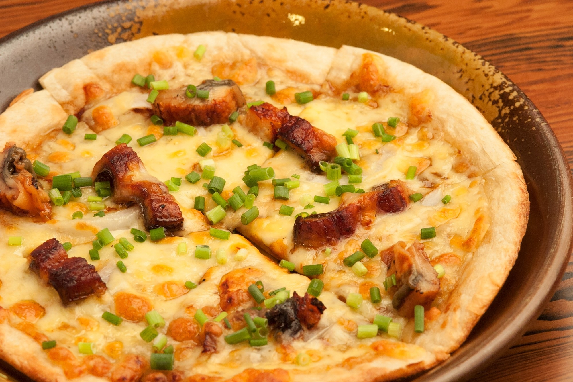 ③うなぎの蒲焼を温め、適当な大きさに切り、ピザ生地の上に均等に配置する。