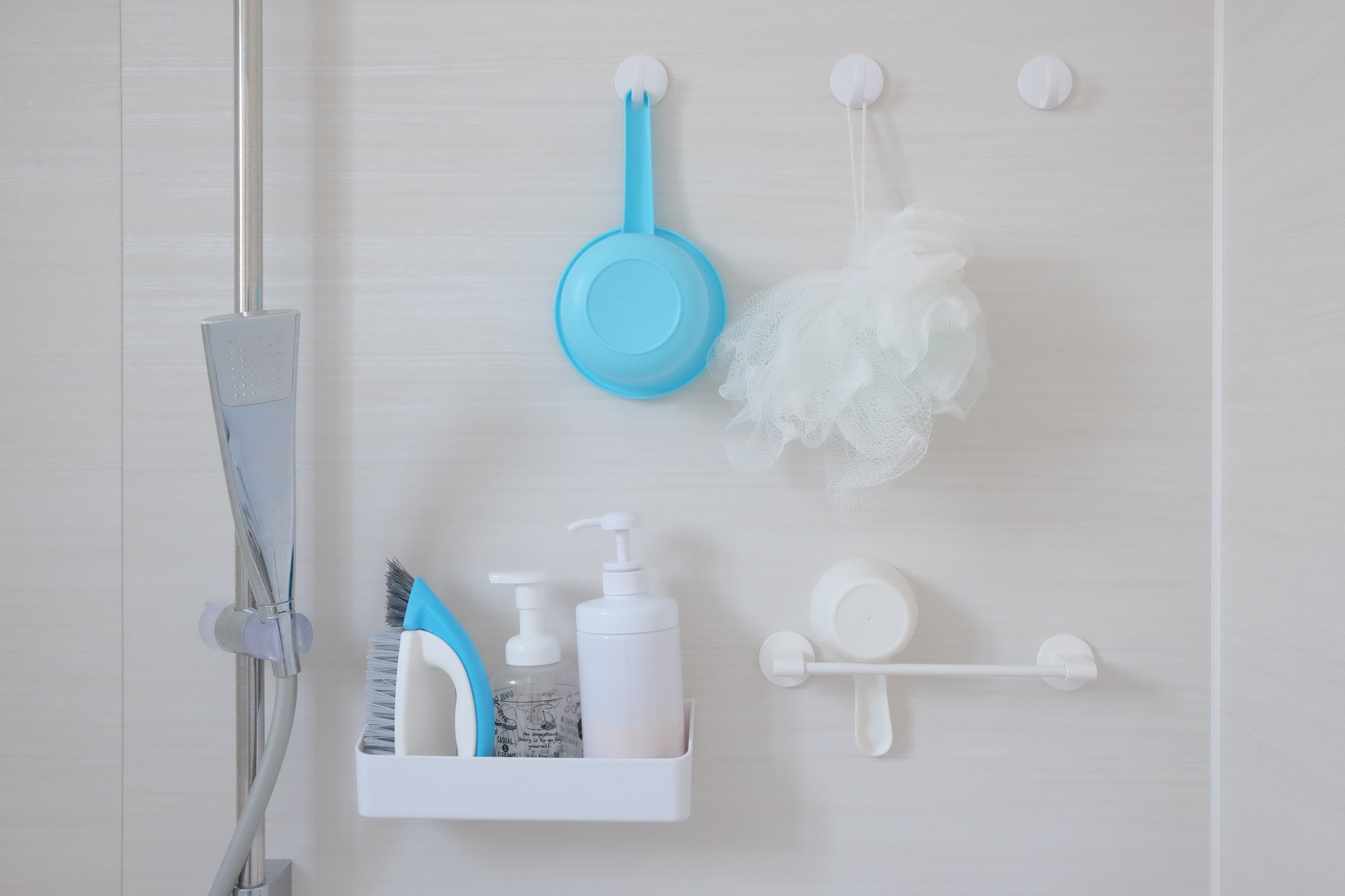 シャンプーやリンス・石鹸など、小物類は、できる限り床や棚に置いたままにしないようにしましょう。小物が直接置かれていると、接地面が乾きにくくなり、カビが生える原因となります。最近では、浴室の小物を吊るして収納できるなど、便利なグッズが市販されています。ぜひ活用してみましょう。