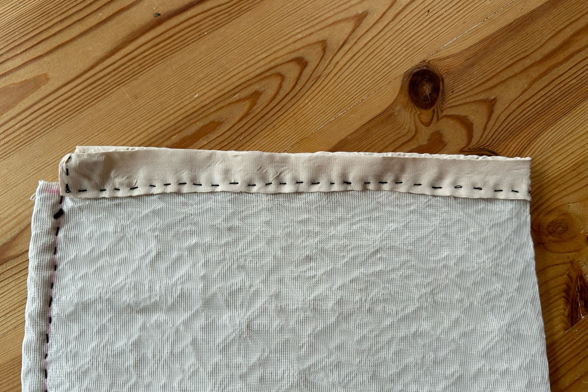 これで三つ折りになりました。最初に折った5mm幅の部分に糸が通るように、端から端までぐるっと、細かな縫い目でなみ縫いします。二枚重ねて縫わないように注意。