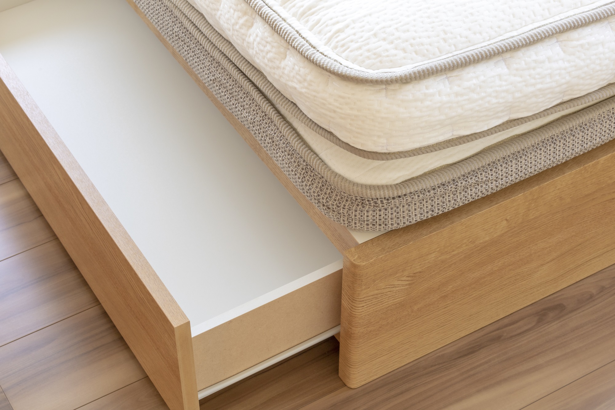 引き出しや跳ね上げ式の収納がついたベッドを活用することで、スペースを有効に使うことができます。