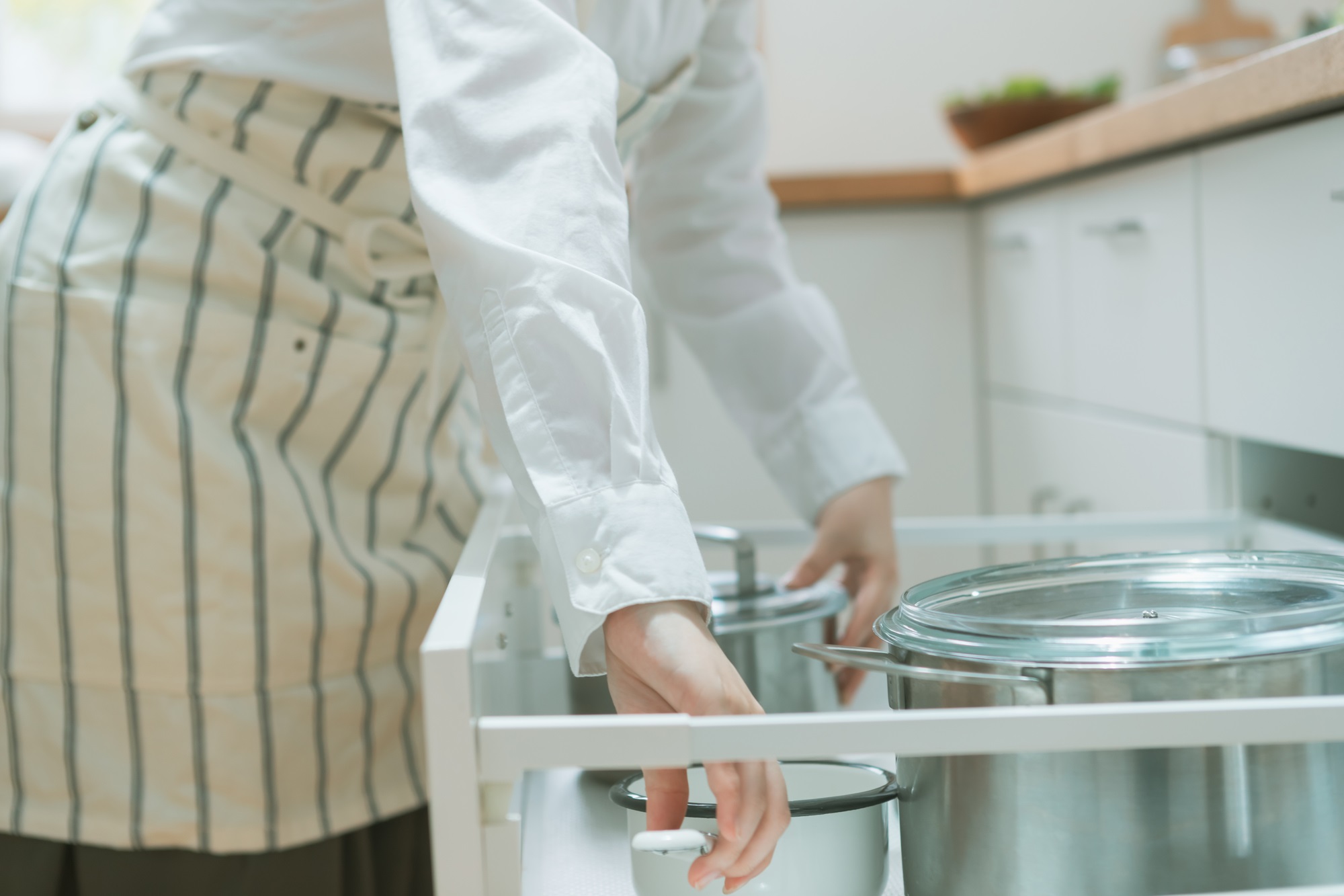 キッチンは物が多くなりがちです。調理器具や食器、食材、調味料など日常的に使うアイテムが多く、さらに収納スペースも限られているため、物があふれやすくなります。隠す収納を取り入れて、スッキリと使いやすい空間にしましょう。