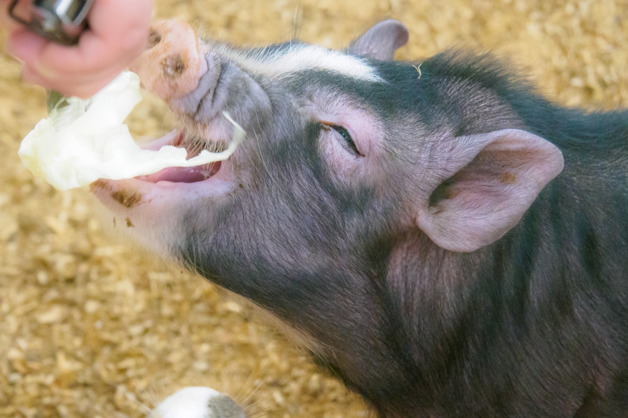 ピッグフードのほか、野菜、果物、大豆製品などを食べます。キッチンで人間の食事の準備をしていると必ず足元に現れるので、サラダや果物、豆腐やナッツ類をおすそ分けすることもありますよ。