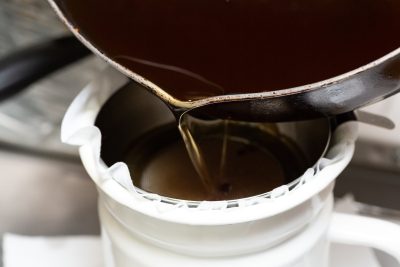 40〜50度のお湯に、酸素系漂白剤を溶かします。製品のラベル表示に従って、適切な量を使用しましょう。漂白剤が完全に溶けるまで、よくかき混ぜてください。
