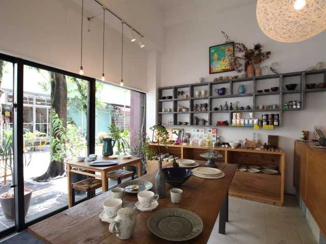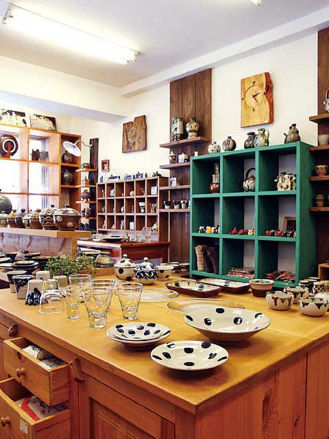 県内外からセレクトした、テーブルウエアを中心とした品ぞろえ。2階はギャラリーになっており、県内外の作家の企画展が開催される。