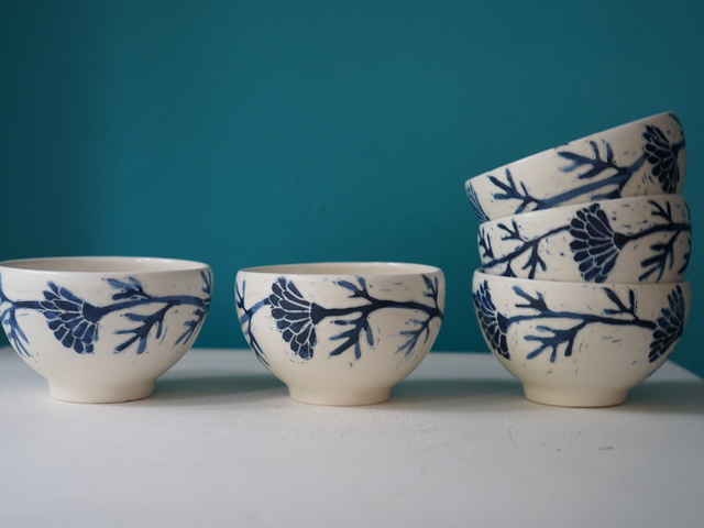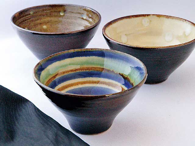 昔ながらに蹴ロクロを行なう陶房みんどぅまの直営店。普段使いにぴったりのドットやストライプ柄の器や、手のひらサイズの壺に注目を。