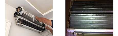 エアコンのカバーを外して洗浄液を霧状にして散布します。業務用の機材を使用して洗浄することにより、通常の手作業では落ちない部分まで徹底的に取り除くことが可能です。また、タバコのヤニやハウスダストなどの汚れを徹底的に除去することにより、電気代の節約効果も期待ができます。
