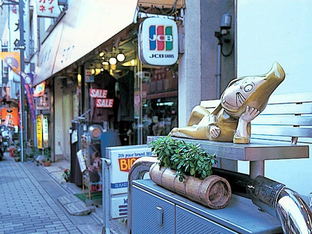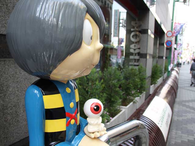 漫画家水木しげるの事務所近くで鬼太郎やネズミ男などの像がある