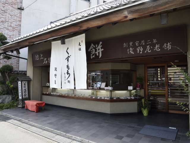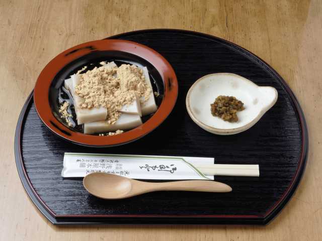 宝暦2(1752)年の創業以来、変わらぬ材料と製法で上質なくず餅を作り続ける。ぷるっと弾力があるくず餅は食べごたえ十分。隠れた名物の焼きうどんと一緒に味わいたい。