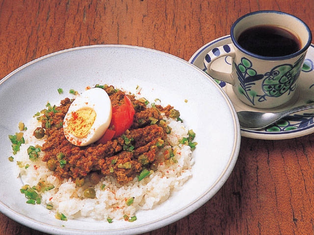 一杯一杯丁寧にいれるコーヒーはもちろん、名物メニューのカレー(キーマと野菜、ココナッツの3種類)はどれもルーから作り定評がある。和風のオムごはんもこだわりの一品。